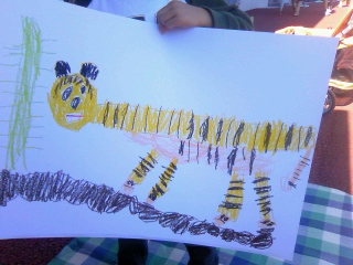 場所を取り 一生懸命トラを書いている孫のそばでトラ