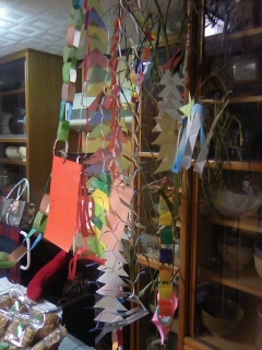 思い思いの飾りを作った笹飾りが完成している。