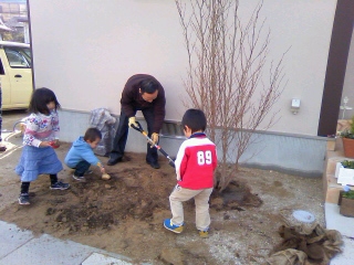 みんなで力を合わせて土を掘ったりしながら、ゆっくり庭を作り