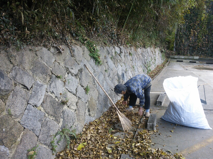 毎朝まずやることは、落ち葉の掃除から。掃いても掃いても落ちてくる落ち葉にはうんざりだけど、丁寧に掃除をしてくれるおばあちゃんには頭が下がります。