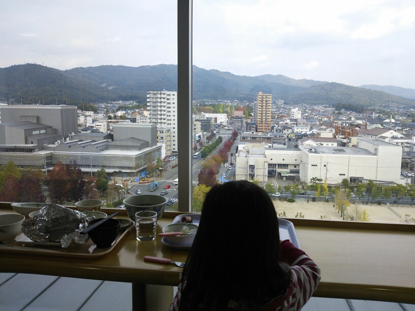 市役所の中にある展望食堂で、2歳児と景色を見ながら食事中♪