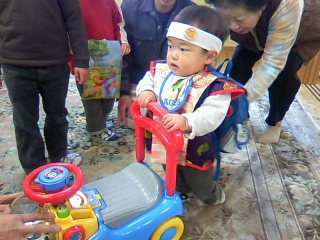 お餅を背負って歩く恒例行事にみんなで声援を送り、賑やかな誕生会と