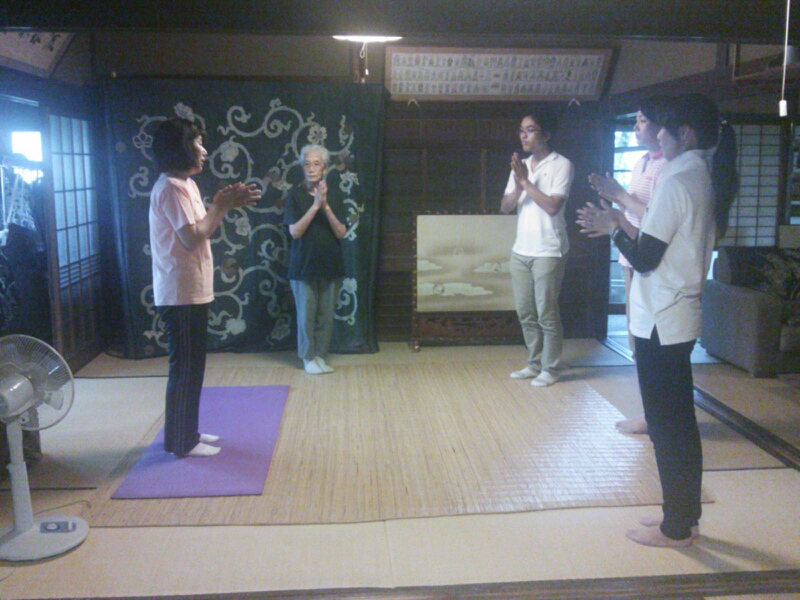 社会福祉協議会に実習生で来ている3人の学生さんが、朝から遊びに来てくれていたので、おばあちゃんと一緒にゆる体操へ参加してとても気持ちがいいと楽しそうだった。